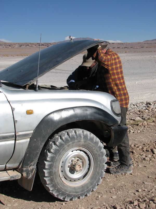 | Nach fünf Tagen mordsmäßiger Rüttelei auf Schotter und übelster Wellblechpiste,die auch der Jeep nicht so ganz schadlos überstanden hat, sind wir endlich da angekommen, wo wir eigentlich schon seit zwei Wochen sein sollten: In Chile! | ![]() | |||