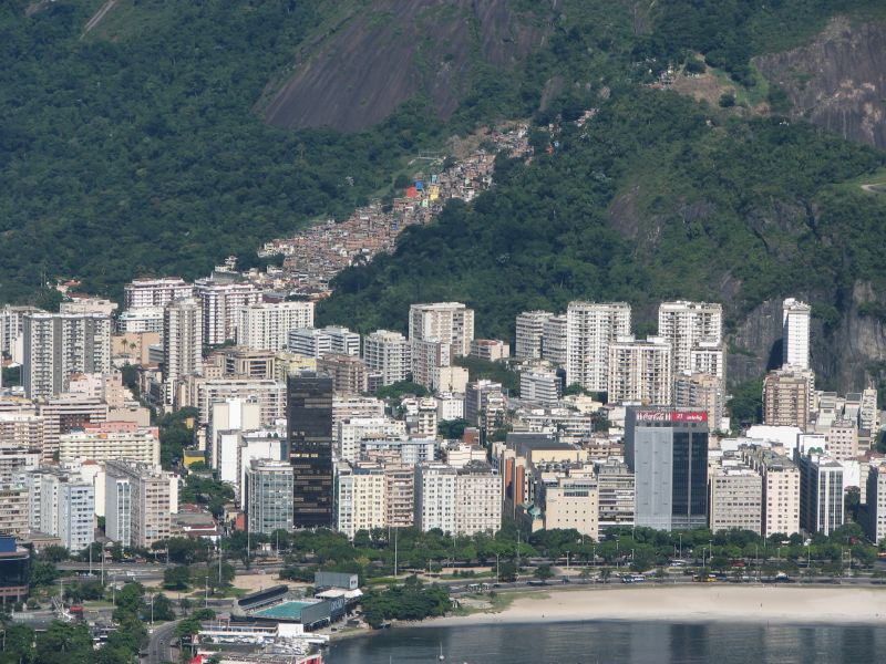 | Nicht nur Sonnenseiten: Unmittelbar hinter den luxuriösen Hochhäusern siedeln sich die Favelas an, die Wohnviertel der armen Bevölkerung Rios. | ||