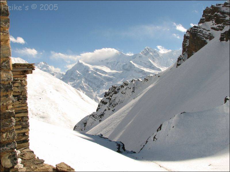 Aber diese Schönheit ist auch tückisch: an steileren Hängen rutschen immer wieder keine Lawinen ab, mehrmals treibt uns Dipendra im Laufschritt unter Schneewolken und rieselnden Steinchenregen weiter!!