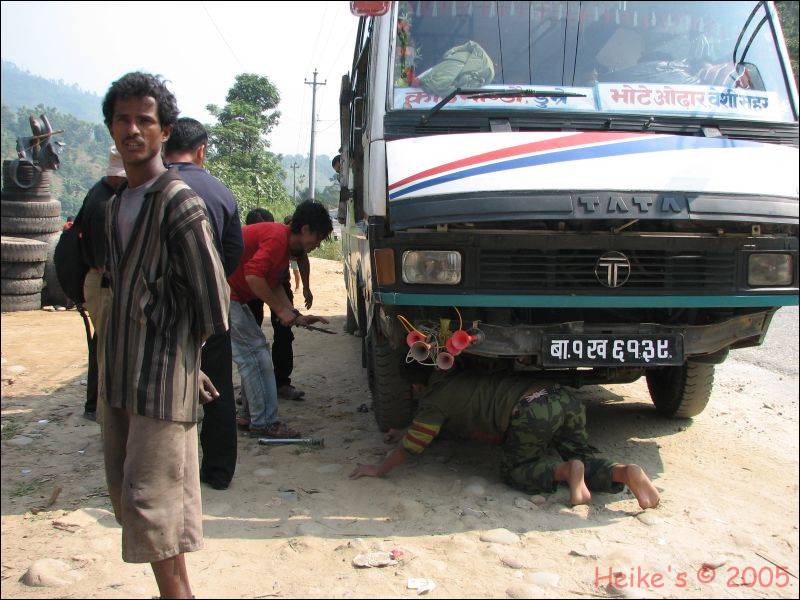 Ich sehe uns schon im Bus übernachten (weit und breit ist außer der kleinen Werkstatt absolut nichts Bewohntes in Sicht!), aber wir haben Glück: zweieinhalb Stunden später ist der Bus wieder flott!!